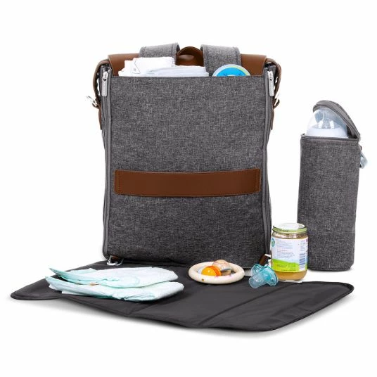 Für Babys Fläschchen gibt es einen isolierten Flaschenhalter, den Du einzeln entnehmen kannst. Dieser ist ebenfalls im Design der Tasche gehalten und hält den Fläschcheninhalt länger warm oder kalt. Mit der pflegeleichten Wickelunterlage kannst Du Deinem Baby überall unterwegs hygienisch die Windel wechseln. Des Weiteren ist eine kleine Utensilientasche enthalten, in der Du Kleinigkeiten wie Deinen Schlüssel, Geld, Bankkarte etc. unterbringen kannst. Außen hat die Wickeltasche zwei weitere Reißverschlussfächer und zwei offene Fächer, für die Dinge, die Du gerne schnell zur Hand hast.