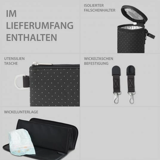 Für Babys Fläschchen gibt es einen isolierten Flaschenhalter, den Du einzeln entnehmen kannst. Dieser ist ebenfalls im Design der Tasche gehalten und hält den Fläschcheninhalt länger warm oder kalt. Mit der pflegeleichten Wickelunterlage kannst Du Deinem Baby überall unterwegs hygienisch die Windel wechseln. Des Weiteren ist eine kleine Utensilientasche enthalten, in der Du Kleinigkeiten wie Deinen Schlüssel, Geld, Bankkarte etc. unterbringen kannst. Außen hat die Wickeltasche zwei weitere Reißverschlussfächer und zwei offene Fächer, für die Dinge, die Du gerne schnell zur Hand hast.