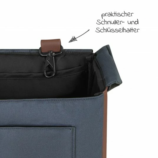 Des Weiteren ist eine kleine Utensilientasche enthalten, in der Du wichtige Kleinigkeiten, wie Deinen Schlüssel, Kleingeld etc. verstauen kannst. An dem praktischen Karabiner in der Wickeltasche kannst Du diese Utensilientasche, aber auch Deinen Wohnungsschlüssel befestigen und ersparst Dir das Suchen danach.