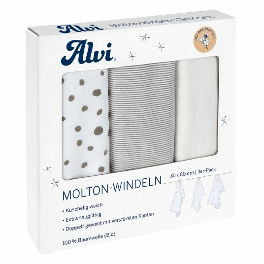 Moltonwindeln sind sehr beliebt und weiterhin ein Klassiker, der in der Baby-Grundausstattung nicht fehlen darf. Mit den ALVI Moltonwindeln Organic Cotton – Aqua Dots im 3er Pack hast Du praktische Alleskönner für den Alltag mit Deinem Baby. Sie sind mit 80 x 80 cm nicht nur als Windel verwendbar, sondern auch als Waschlappen, Spucktuch, Wickelunterlage ideal geeignet.