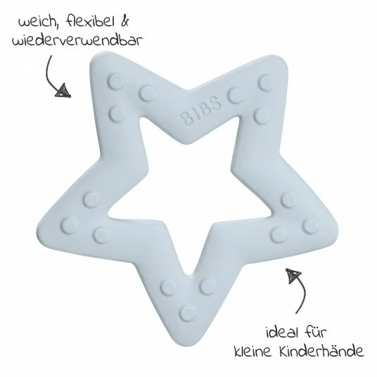 Die unterschiedlich ausgeprägte und strukturierte Oberfläche massiert beim Kauen das Zahnfleisch und beruhigt den Spannungsschmerz. Der BIBS Beißring wurde nicht nur speziell dafür entwickelt, die Zahnungszeit zu erleichtern, sondern zugleich die Sinne und Feinmotorik Deines Lieblings anzuregen. Dank der unterschiedlichen Texturen wird der Tastsinn gefördert. Der Beißring begeistert mit einem niedlichen Sternen-Design in schönem Farbton.