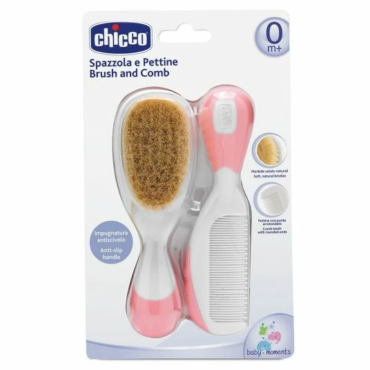 Das Set aus Kamm und Bürste von Chicco eignet sich hervorragend zur Pflege von feinem Babyhaar. Die Bürste hat weiche Naturborsten aus Ziegenhaar. Die Borsten schonen Babys Haarstruktur schonen und massieren gleichzeitig sanft die Kopfhaut. Der Kamm hat extra abgerundete Spitzen.