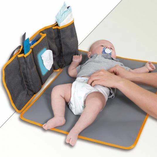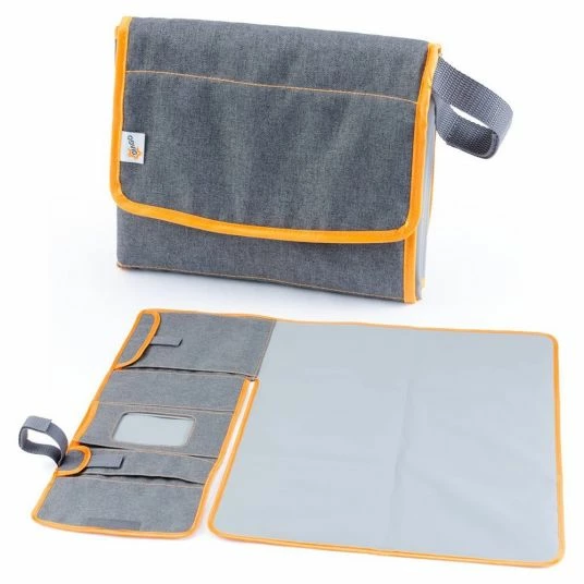 Das Wickelkit ist aus hochwertigem grau-meliertem Polyester-Twill mit orangefarbener Umrandung und abwaschbarer Wickelunterlage gefertigt.