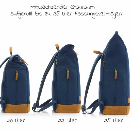 Es muss nicht immer eine klassische Wickeltasche sein: Wer beide Hände unterwegs frei haben und dennoch alles Wichtige zum Wickeln dabei haben möchte, findet im Wickelrucksack Rolltop Canvas mit Echtlederapplikationen – Navy von Fillikid den idealen Begleiter. Der Rucksack sorgt dank seiner Öffnung im Rolltop-Styl für Flexibilität. Muss mal etwas mehr mitgenommen werden, rollst Du den Rucksack auf und hast im Handumdrehen zusätzlichen Stauraum oder Platz für längliche Gegenstände. Zusammengerollt lässt er sich einfach mit einem Magnetverschluss schließen. Der sportliche Rucksack ist aus hochwertigem Canvas gefertigt – robustem Leinen Segeltuch aus reiner Baumwolle. Verschlüsse und Applikationen aus echtem Leder.
