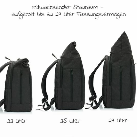 Durch den Rolltop-Verschluss lässt sich das Volumen von 22 Liter auf 25 Liter und wenn er ganz offen ist, sogar auf 27 Liter vergrößern. Mit dem praktischen Klickverschluss lässt sich der Rucksack in Sekundenschnelle öffnen. Zusätzlich befindet auf der Rückseite noch eine großes Extrafach wo du entweder wichtige Dinge für dein Kind wie etwa Kleidung oder eine Decke verstauen kannst oder eben später einen Laptop, Magazine oder andere flache Gegenstände! Durch die zwei Reißverschlüsse auf der Vorderseite erreichst du einerseits ein praktisches Fach das Platz bietet für die inkludierte Wickelauflage und andererseits kannst du hier auch direkt ins Innere des Rucksacks wenn du mal Dinge benötigst die weit unten sind. Ein kleines Extrafach auf der Rückseite bietet außerdem sicheren Stauraum für die Geldbörse, den Schlüssel oder andere wichtige Gegenstände und schützt damit zuverlässig vor Langfingern. Über diesem Fach befindet sich auch noch der Trollygurt mit dem der Rucksack auf einem Trolly befestigt werden kann.