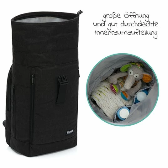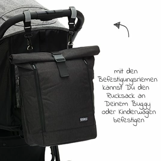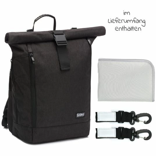 Es muss nicht immer eine klassische Wickeltasche sein: Wer beide Hände unterwegs frei haben und dennoch alles Wichtige zum Wickeln dabei haben möchte, findet im Wickelrucksack Rolltop Dublin – Schwarz von Fillikid den idealen Begleiter. Der Rucksack sorgt dank seiner Öffnung im Rolltop-Styl für Flexibilität. Muss mal etwas mehr mitgenommen werden, rollst Du den Rucksack auf und hast im Handumdrehen zusätzlichen Stauraum oder Platz für längliche Gegenstände. Zusammengerollt lässt er sich einfach mit einem Klickverschluss schließen. Der sportliche Rucksack Besitzt außerdem noch ein extra Laptopfach mit Zipper.
