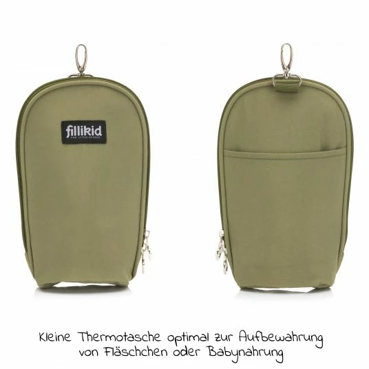 Mit Baby oder Kleinkind unterwegs zu sein bedeutet: Du brauchst von den Windeln über Feuchttücher bis hin zu kleinen Snacks oder einem Schnuller vieles an Zubehör! Mit der Wickeltasche Palma mit Wickelunterlage und Thermotasche – Oliv von Fillikid hast Du alles Wichtige griffbereit verstaut und bist dazu noch besonders modisch unterwegs. Ob als lässiger Shopper mit Trageriemen, als stylishe Henkeltasche oder entspannt am Kinderwagen angebracht – die Fillikid Wickeltasche wird garantiert zum langjährigen Begleiter.