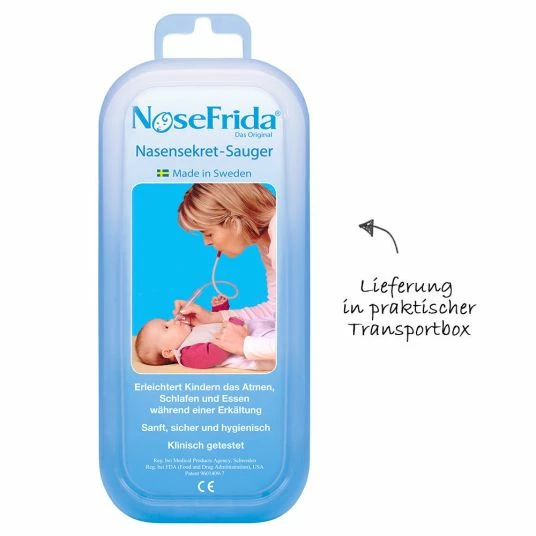 Medizinisch-technisches Produkt der Klasse 1. Entwickelt von Hals- Nasen- Ohren- und Kinderärzten. Empfohlen von Hebammen und Ärzten. Patentiert und hergestellt in Schweden. Ergebnis bei einer Befragung von 2500 Kinderärzten: 3 von 4 Kinderärzte würden NoseFrida weiterempfehlen.