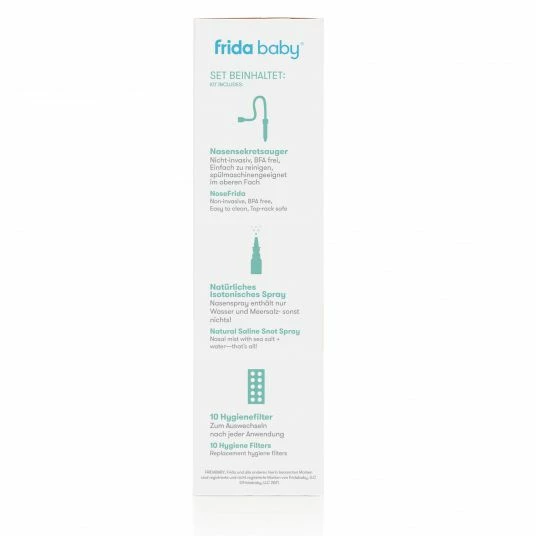 Ohje Dein kleiner Schatz ist erkältet und hat ein verstopftes Näschen? Mit dem mundbetriebenen frida baby Schnupfen-Set NoseFrida Nasensauger mit Hygienefilter und Meersalz-Nasenspray kannst Du ihm sanft und schnell helfen. Dazu wird die abgerundete Spitze an die Nase gehalten und im Anschluss vorsichtig am roten Mundstück gesaugt. Zwischen dem Auffang-Röhrchen und dem Schlauch befindet sich ein Hygienefilter, so dass nichts aus Baby’s Nase in Deinen Mund gelangen kann.