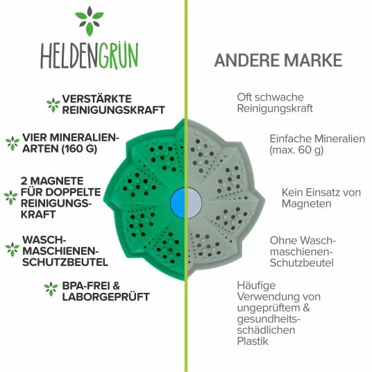 Der Öko-Waschball von Heldengrün verzichtet dank seiner natürlichen Reinigungskraft vollständig auf chemische Zusätze. Seine 4-fache Mineral- und Keramikformel sowie zwei Magnete geben negativ geladene Ionen ab, die den pH-Wert während dem Waschvorgang erhöhen. Die Oberflächenspannung des Wassers wird gebrochen und Verunreinigungen können sich einfacher lösen. Das ist schonend für Haut und Kleidung – ideal für Allergiker, Kinder und empfindliche Haut. Mit dem wiederverwendbaren Öko Waschball vermeidest Du aktiv die Verschmutzung unseres Grundwassers und schonst die Umwelt nachhaltig!
