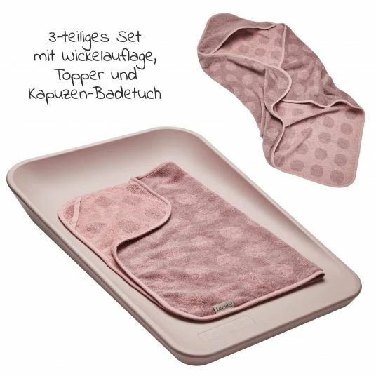 Wir kennen es alle. Wickeln ist oftmals ein Balanceakt und Dein Baby hat nicht immer Lust darauf, sich an und ausziehen zu lassen. Aber umso wohler es sich fühlt, umso entspannter wird auch der Wickelvorgang. Das praktische 3-teilige Set Leander Wickelauflage & Wickelkissen Matty™ inkl. Auflage Topper und Kapuzen-Handtuch Hoodie in Wood Rose bietet dir eine besonders schöne Wickelstation. Das umfangreiche Set beinhaltet eine softe Wickelauflage, einen passenden Topper und ein Kapuzen-badetuch in dezentem Farbton.