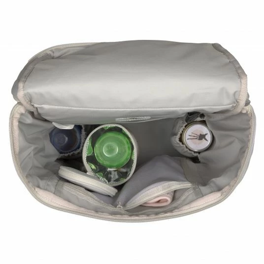 Im Deckel befindet sich außerdem ein Feuchtfach, in dem Windeln oder feuchte Kleidung verstaut werden können. Ein Netzfach sowie zwei Seitentaschen bieten Platz für Wickelzubehör, Kleinigkeiten und Flaschen. Auch außen findest Du eine clevere Aufteilung vor, so dass Du Dich perfekt organisieren kannst.