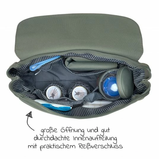 Zusätzlich enthaltenes Zubehör wie eine wasserabweisende Wickelunterlage, eine Utensilientasche, ein isolierter, herausnehmbarer Flaschenhalter sowie eine herausnehmbare Gläschenhalterung oder die Kinderwagenbefestigung runden den Wickelrucksack ab. Gepolsterte, verstellbare Schultergurte und eine praktische Handschlaufe sichern angenehme wie praktische Tragemöglichkeiten.