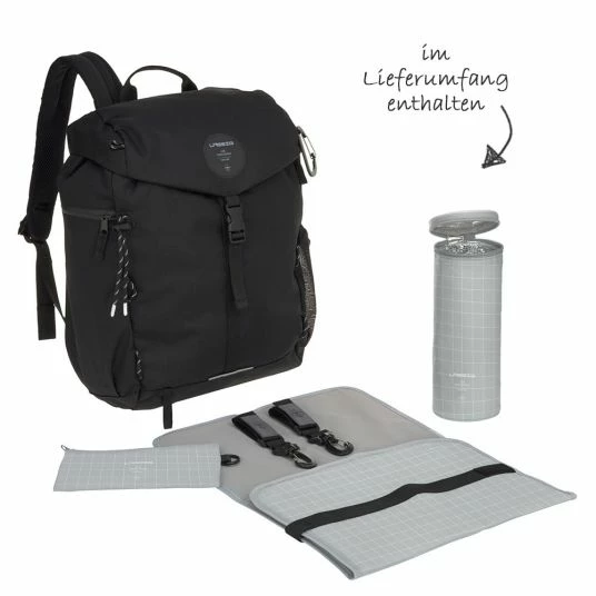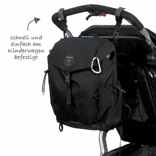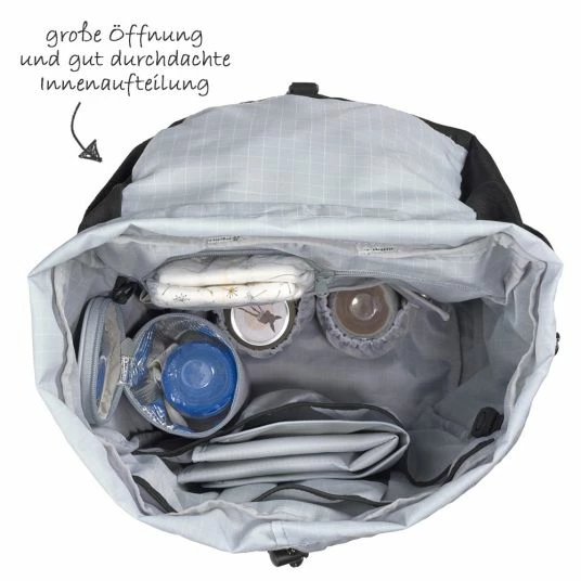 Ein gut durchdachtes Innenleben, Staufächer innen und außen sowie das umfangreiche Wickelzubehör runden den Rucksack ab. Ausgestattet mit einer wasserabweisenden Wickelunterlage, einem isolierten Flaschenhalter, einer herausnehmbaren Gläschenhalterung, einer Kinderwagenbefestigung und einer kleinen Utensilientasche hat man alles, was man unterwegs braucht.