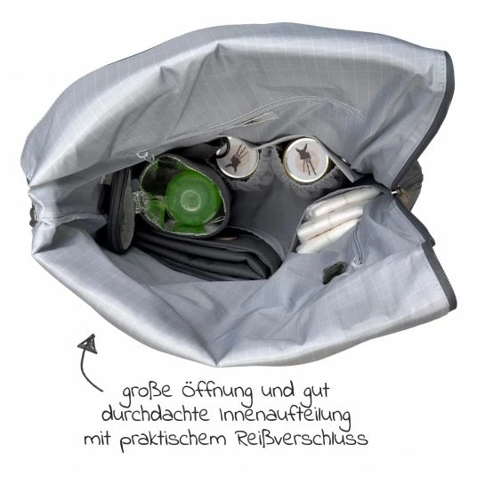 Ausgestattet mit einer wasserabweisenden Wickelunterlage, einem isolierten Flaschenhalter, einer herausnehmbaren Gläschenhalterung, einer Kinderwagenbefestigung und einer kleinen Utensilientasche hat man alles, was man unterwegs so braucht. Mit vielen verschiedenen praktischen Fächern, von innen sowie außen zugänglich, lassen sich alle wichtigen Utensilien durchdacht verstauen.