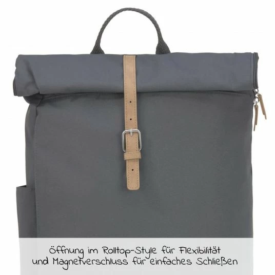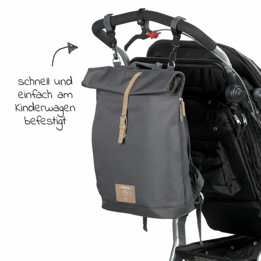 Muss mal etwas mehr im Rucksack mitgenommen werden, rollt man ihn auf und hat im Handumdrehen zusätzlichen Stauraum oder Platz für längliche Gegenstände. Zusammengerollt lässt er sich mit einem einfach Magnetverschluss schließen. Schnellen Zugriff auf das Innenleben hat man durch den über die gesamte seitliche Länge vorhandenen Reißverschluss. Ein Feuchtfach vorne, Reißverschlussfach am Rücken sowie praktisches Zubehör machen ihn zum perfekten Accessoire für Eltern.