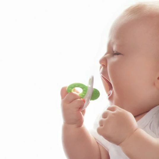 Der extra leichte Bite & Relax kann von kleinen Kinderhänden gut gehalten werden. Ein Schild verhindert, dass der Beißring zu tief in die Mundhöhle rutscht. Außerdem kannst Du eine Schnullerkette daran befestigen, so geht er auch unterwegs nicht verloren.