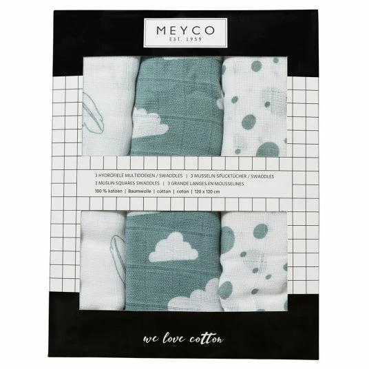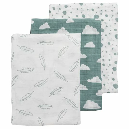 3 Meyco Mull-Pflegetücher 120 x 120 cm – Federn Wolken Dots in Grün