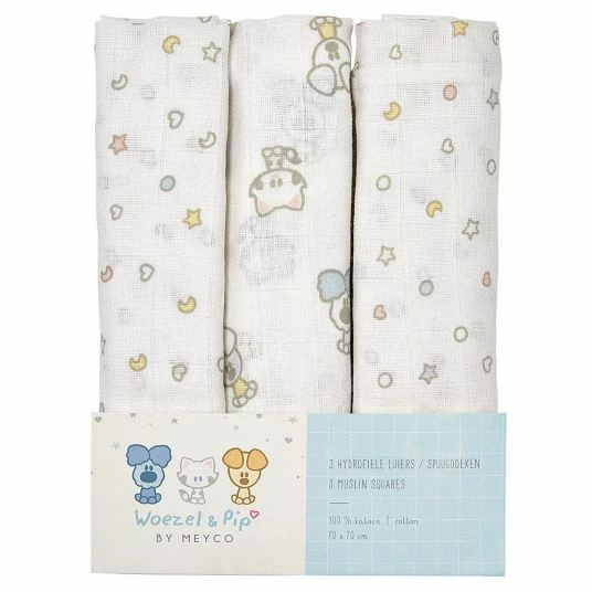 Mittlerweile ist die Auswahl an verschiedenen Windelarten sehr groß, die Mullwindeln bleiben dennoch sehr beliebt und weiterhin ein Klassiker. Mit den Meyco Mullwindeln im Design Woezel & Pip im praktischen 3er Pack mit einer Größe von jeweils 70 x 70 cm hast Du wunderbare Alltagshelfer. Sie sind nicht nur als Windel verwendbar, sondern auch als Waschlappen, Spucktuch, Wickelunterlage oder nach der Windelzeit sogar als Putztuch ideal geeignet.